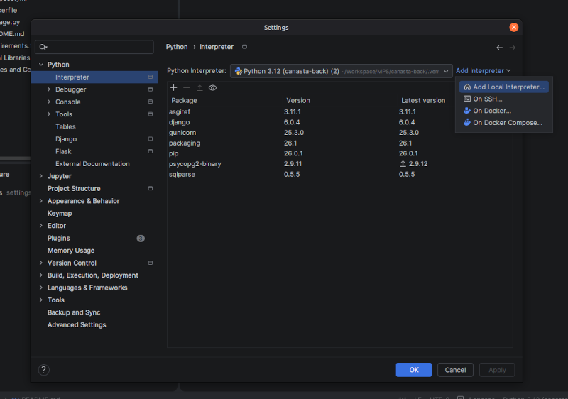 Ventana de Pycharm Settings mostrando la opción "Add Local Interpreter..."